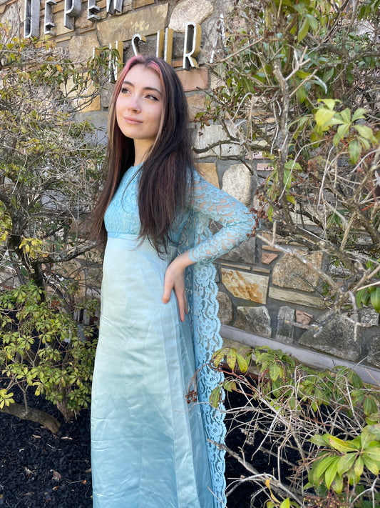 Blue 1960s Gown with Lace Floor-Length Cape, size xs