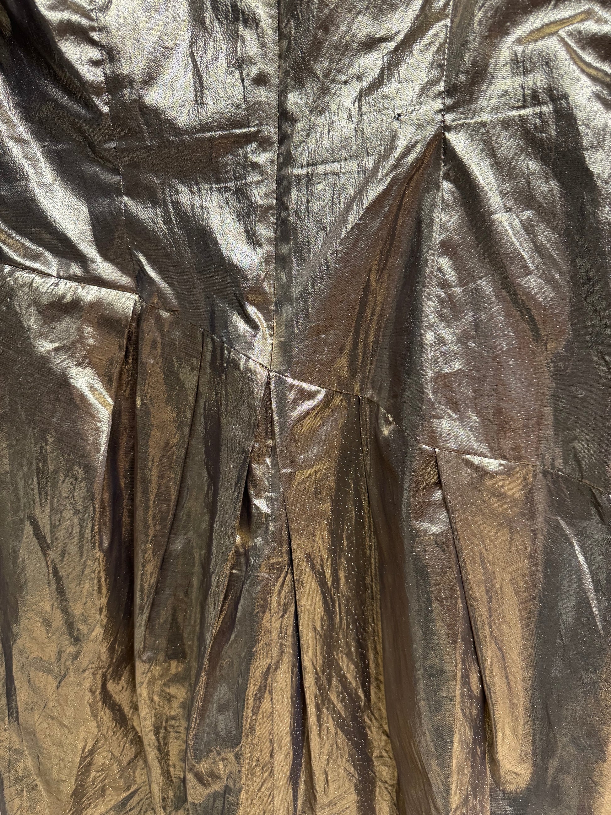 The ultimate 80s statement dress! Big puffed sleeves, shiny gold material, and something like a sideways bow at the hip. Maximalist, retro, and totally radical in every way. So fun! Should fit size 8/10.
