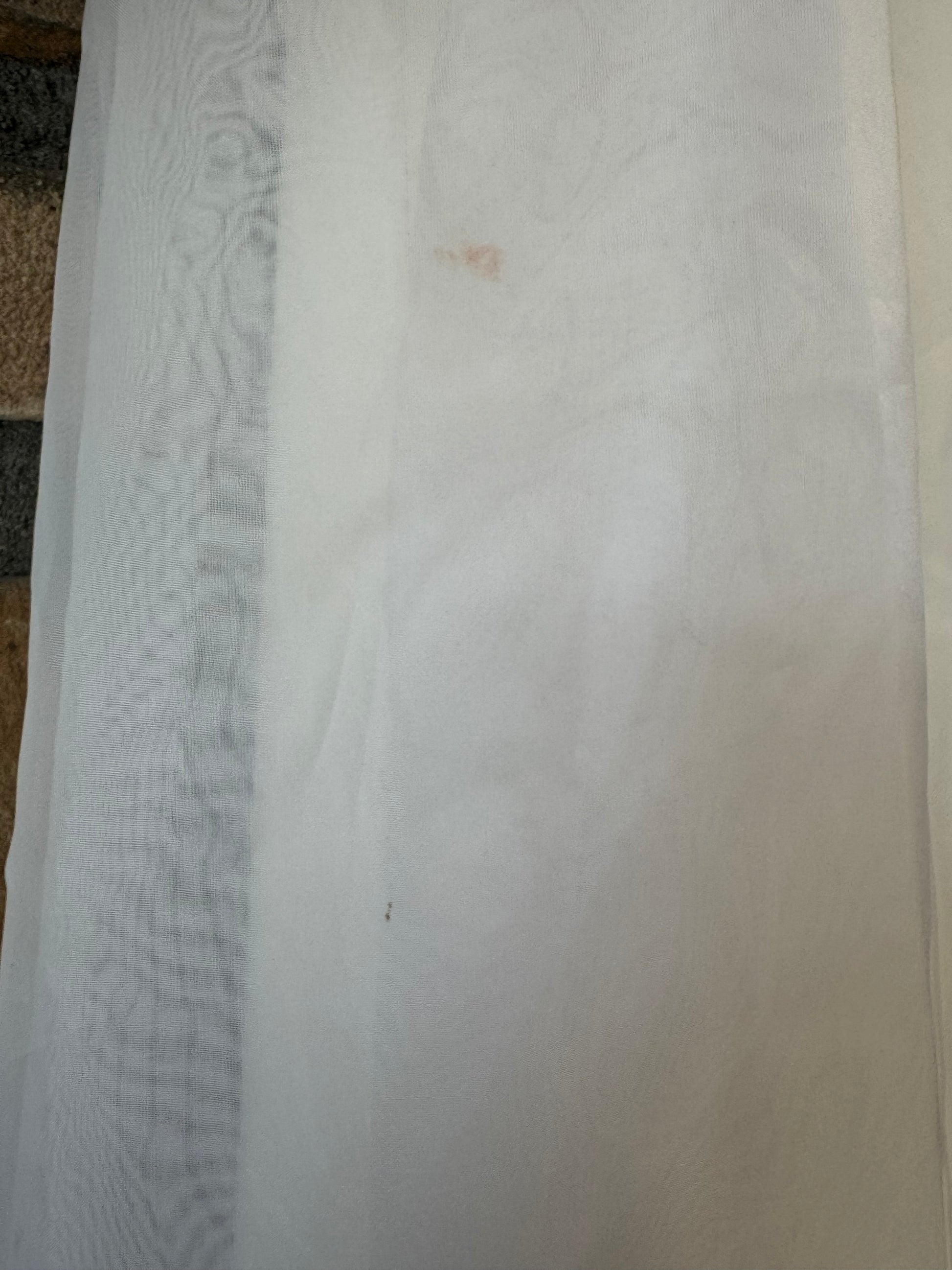 The most quintessential 1960’s wedding dress for a vintage-loving bride. Bohemian, ethereal, and completely unique. With airy puff sleeves and a float-y, unstructured A-line design. The long train elevates it from hippie to bridal. Would also be amazing for a themed photo shoot. The dress is white, with off-white crochet lace at the wrists and neck/chest/shoulders.