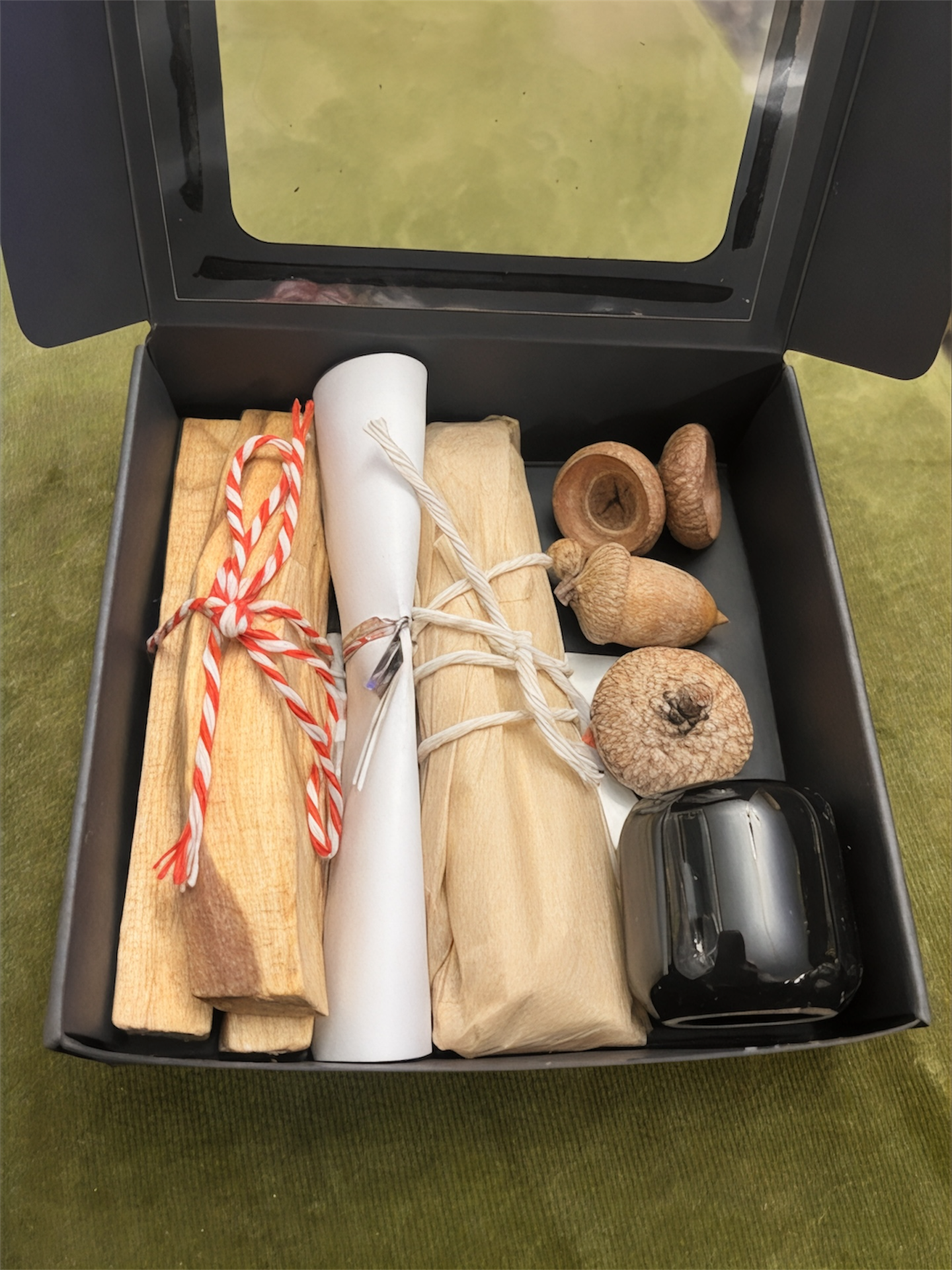 We use acorns and other natural objects as packing not only to protect and secure each item, but also because they carry grounding, protective symbolism of their own, adding a quiet layer of magic to every box.