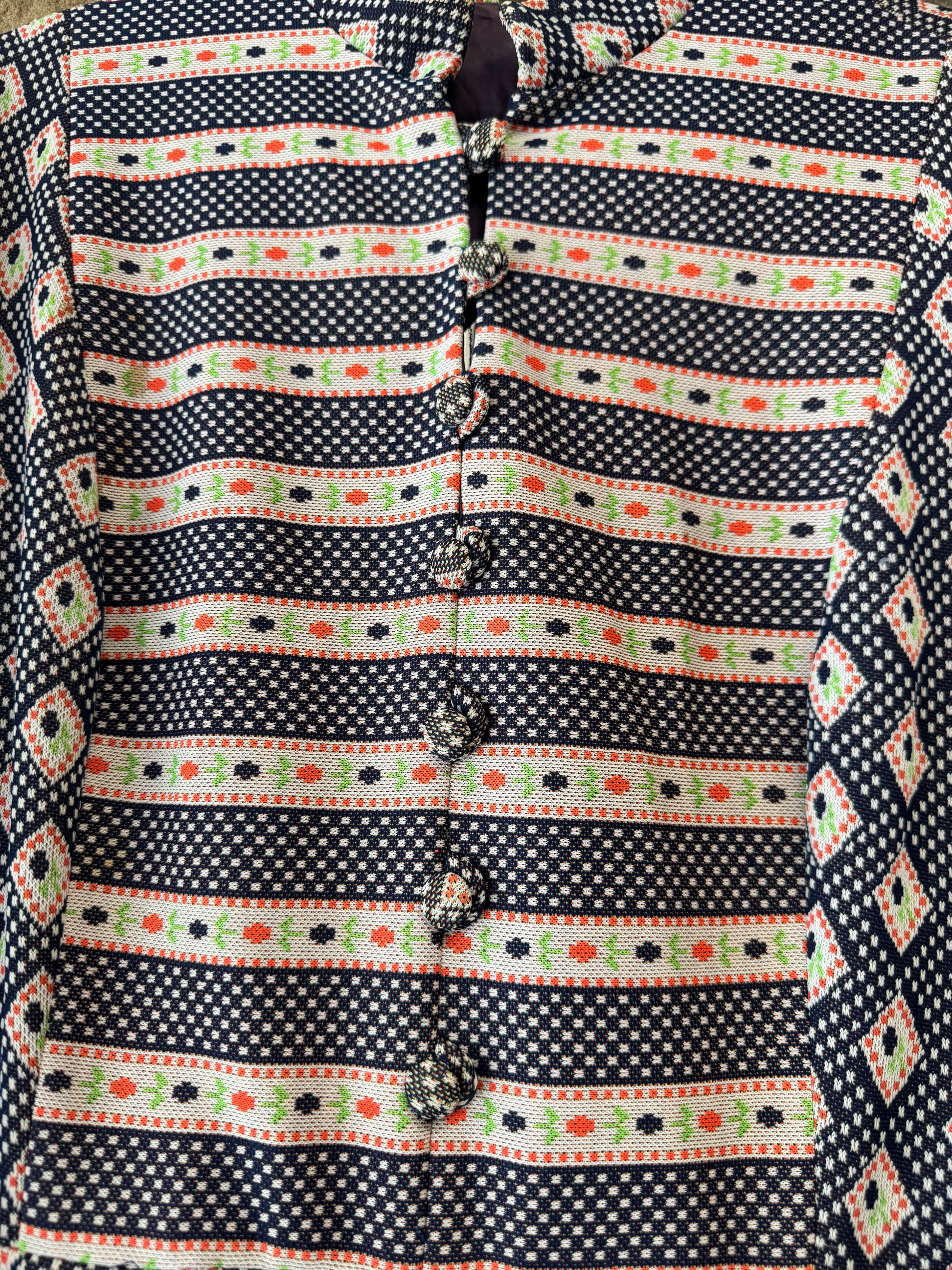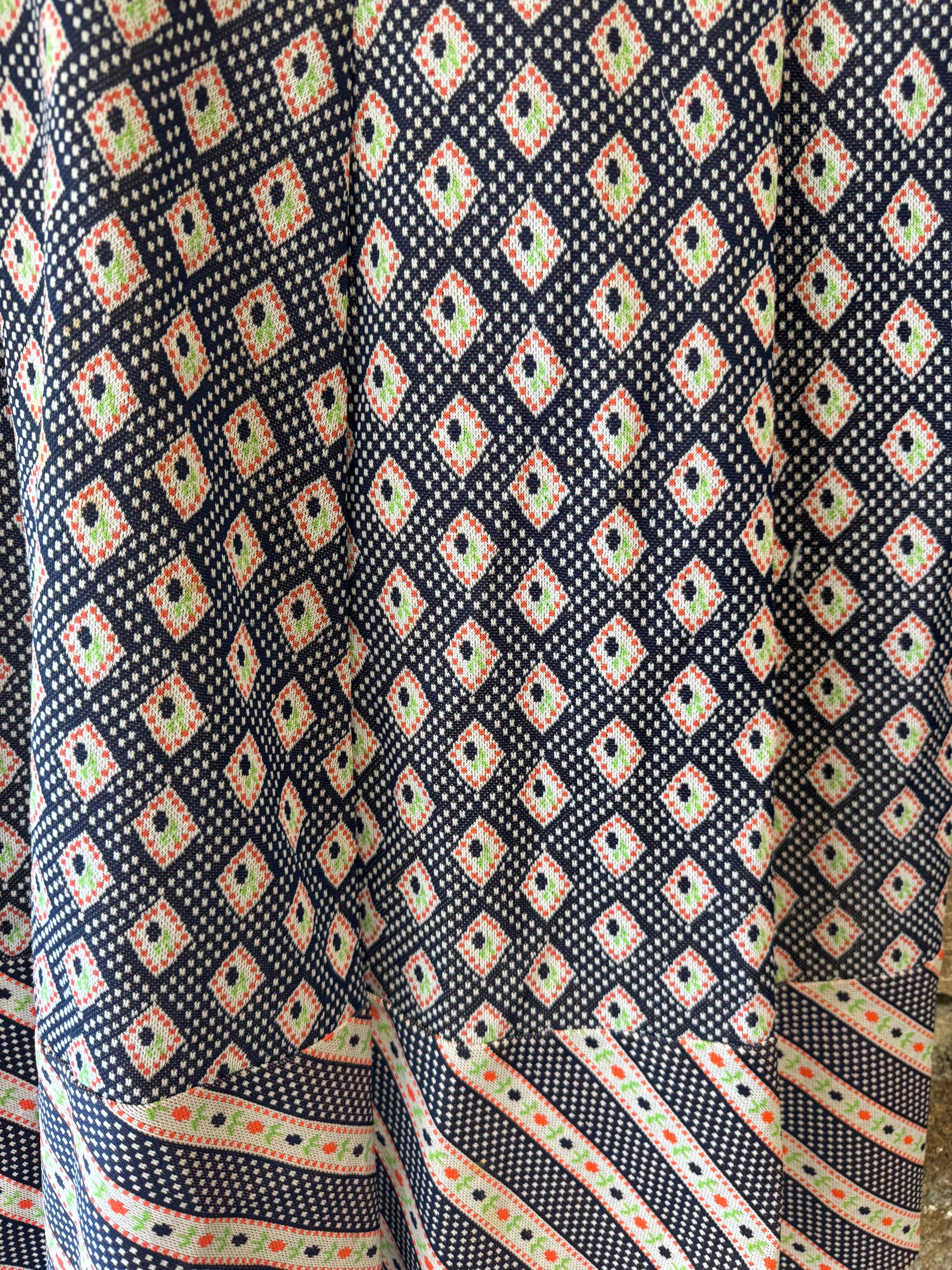 Wow, this is a really fun one! Vintage midi length dress from the 1960s or 70s. Long peasant sleeves. Fit and flare style. Super cool combination of patterns. Band collar and buttons up the front. Nice, heavier weight fabric for cooler weather. Retro, but timeless construction and cool. Zips in back. Will fit approximately 8-10, check measurements.