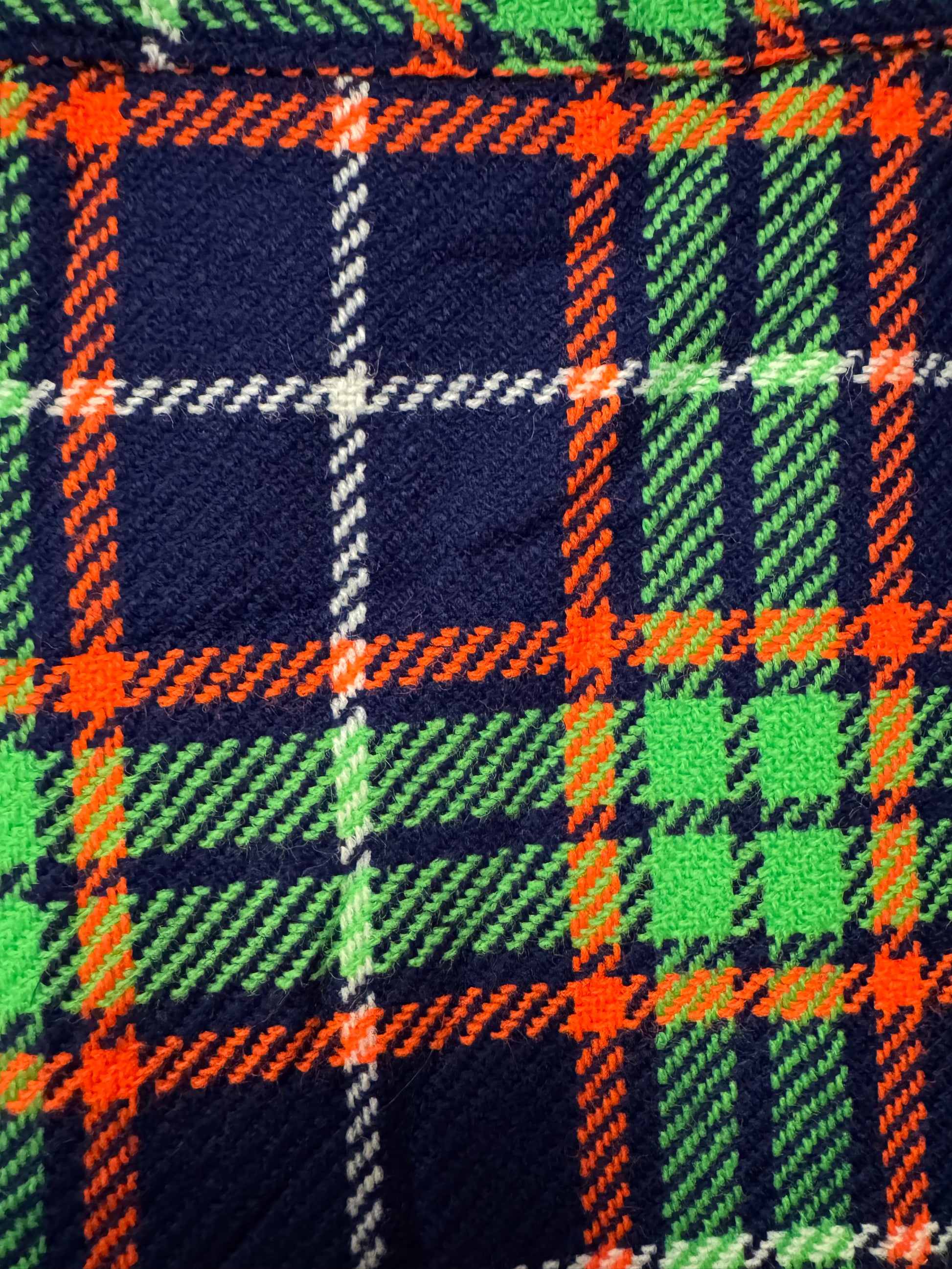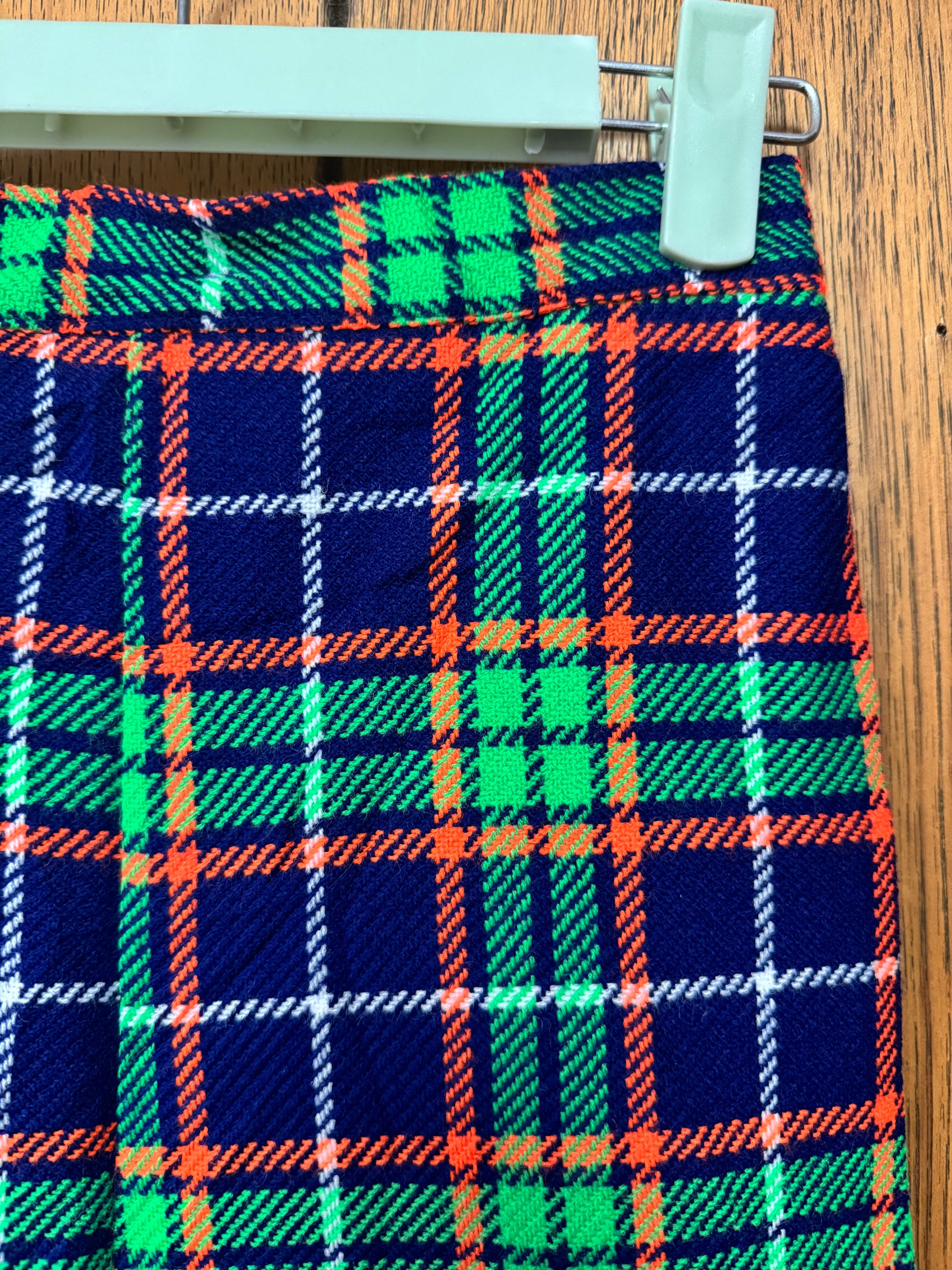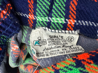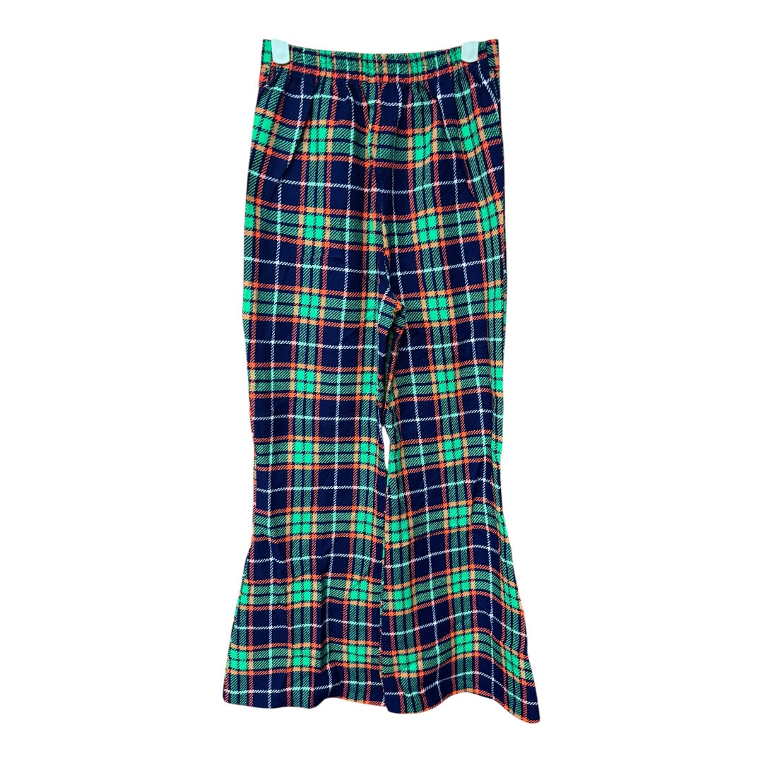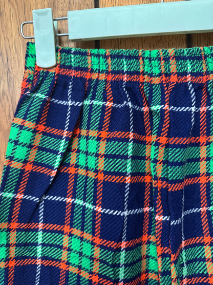 Elastic waist, neon plaid girls trousers in green, orange, and brown. Wool. Vintage 1970s. Bell bottoms. Brady Bunch. Marked size 12.