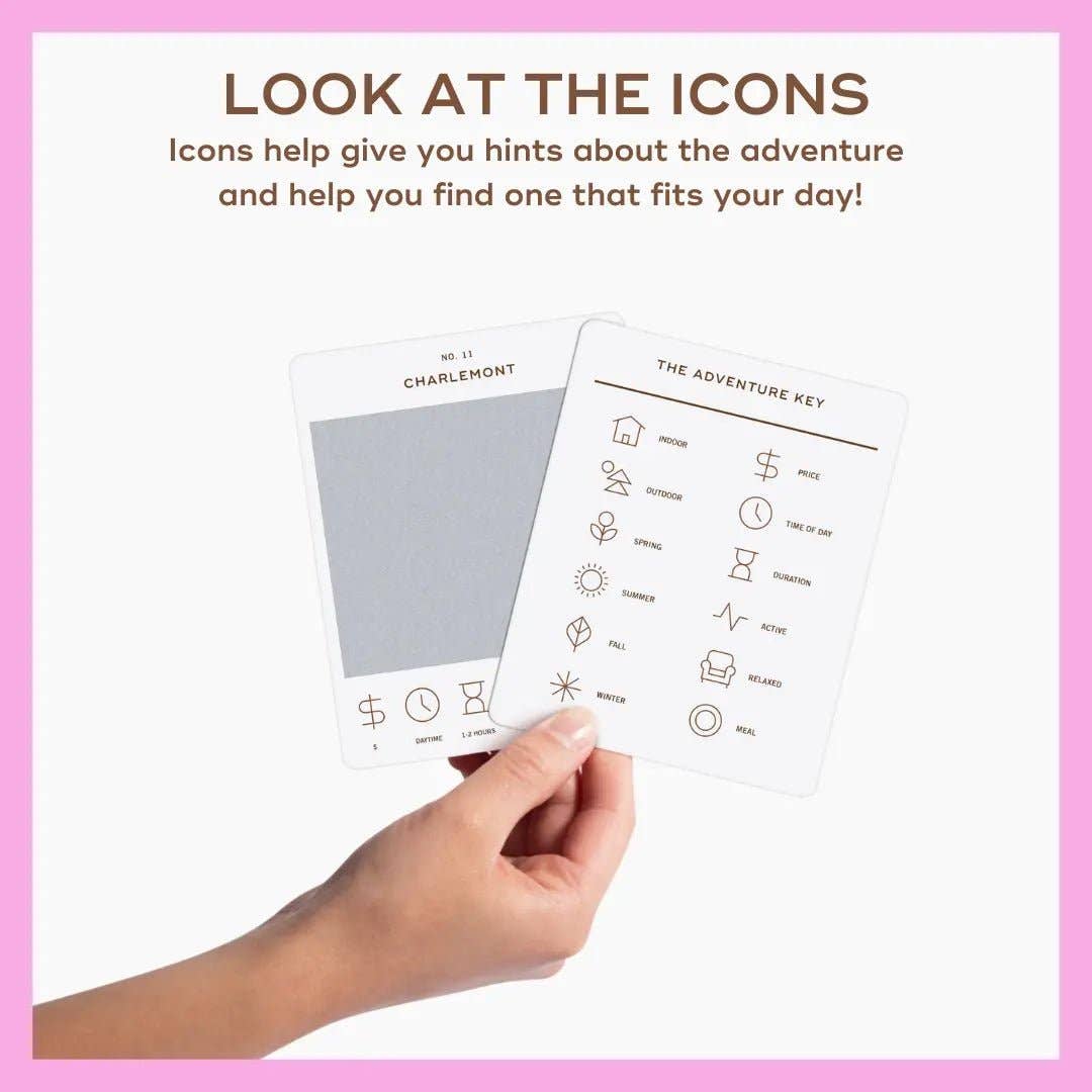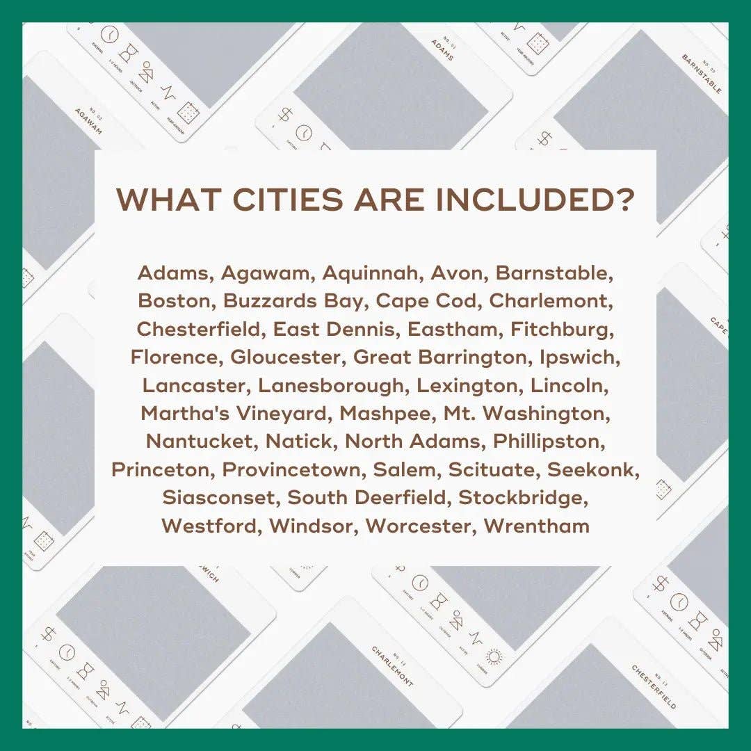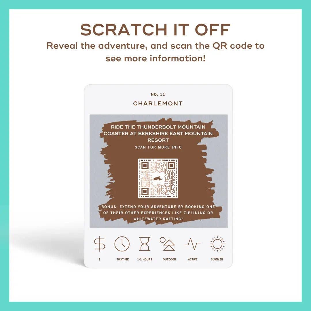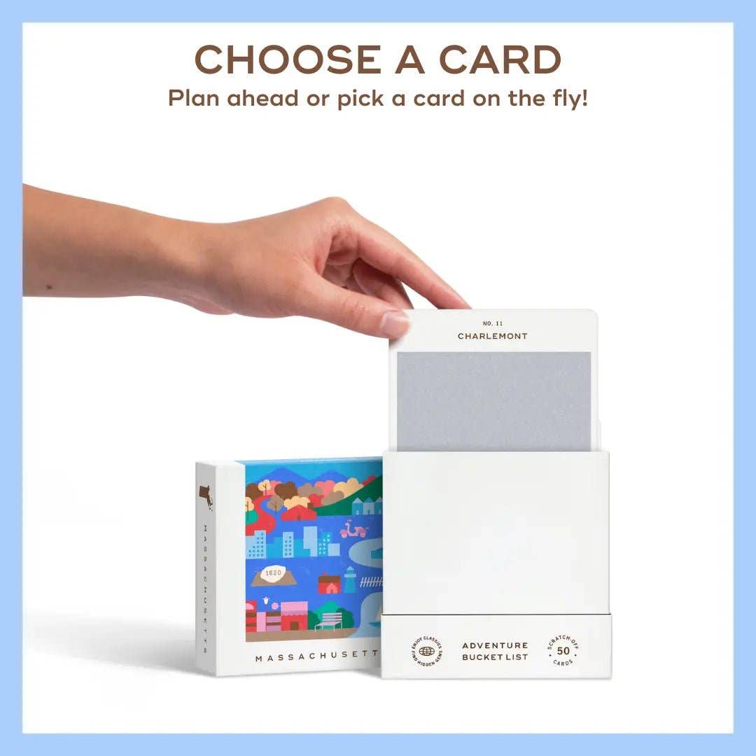 50 scratch off bucket list adventures around the state of Massachusetts. Pick a city that you want to explore, check out the icons at the bottom of the card to determine the season, cost, and time of day, and then scratch off the card to reveal your adventure!