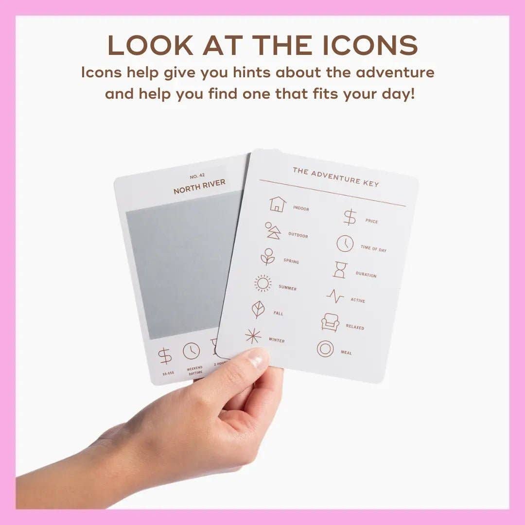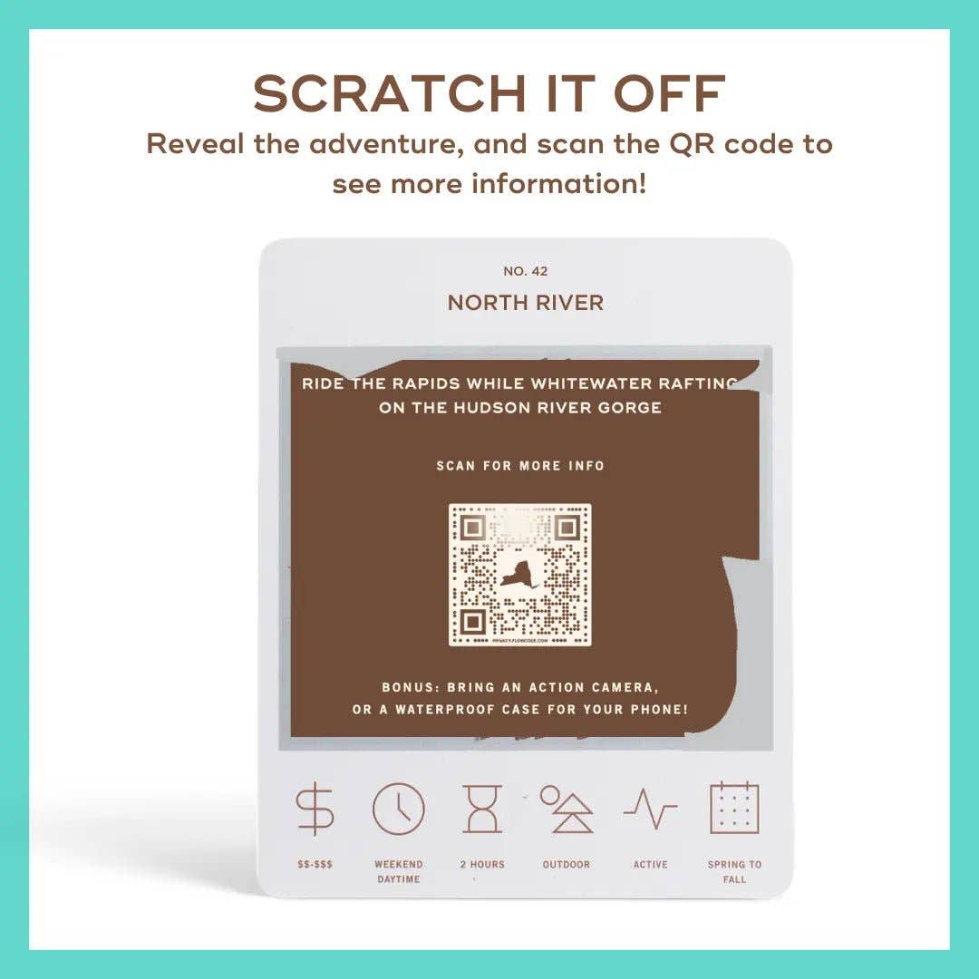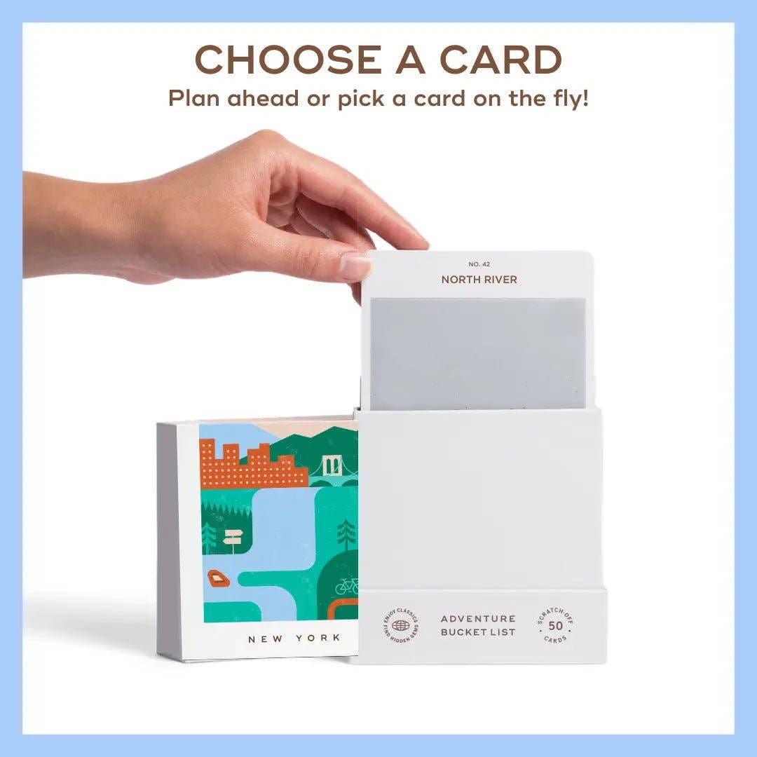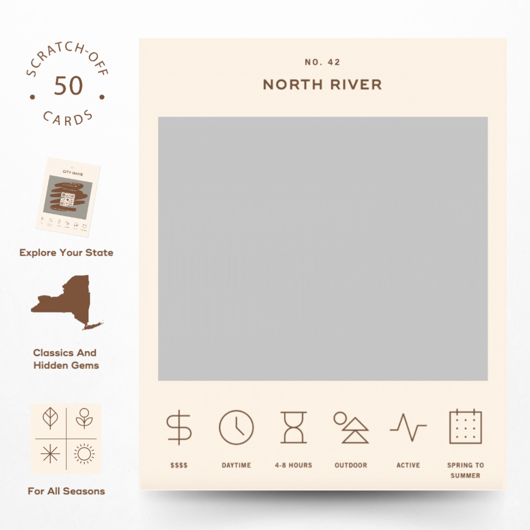 50 scratch off bucket list adventures around the state of New York. Pick a city that you want to explore, check out the icons at the bottom of the card to determine the season, cost, and time of day, and then scratch off the card to reveal your adventure!