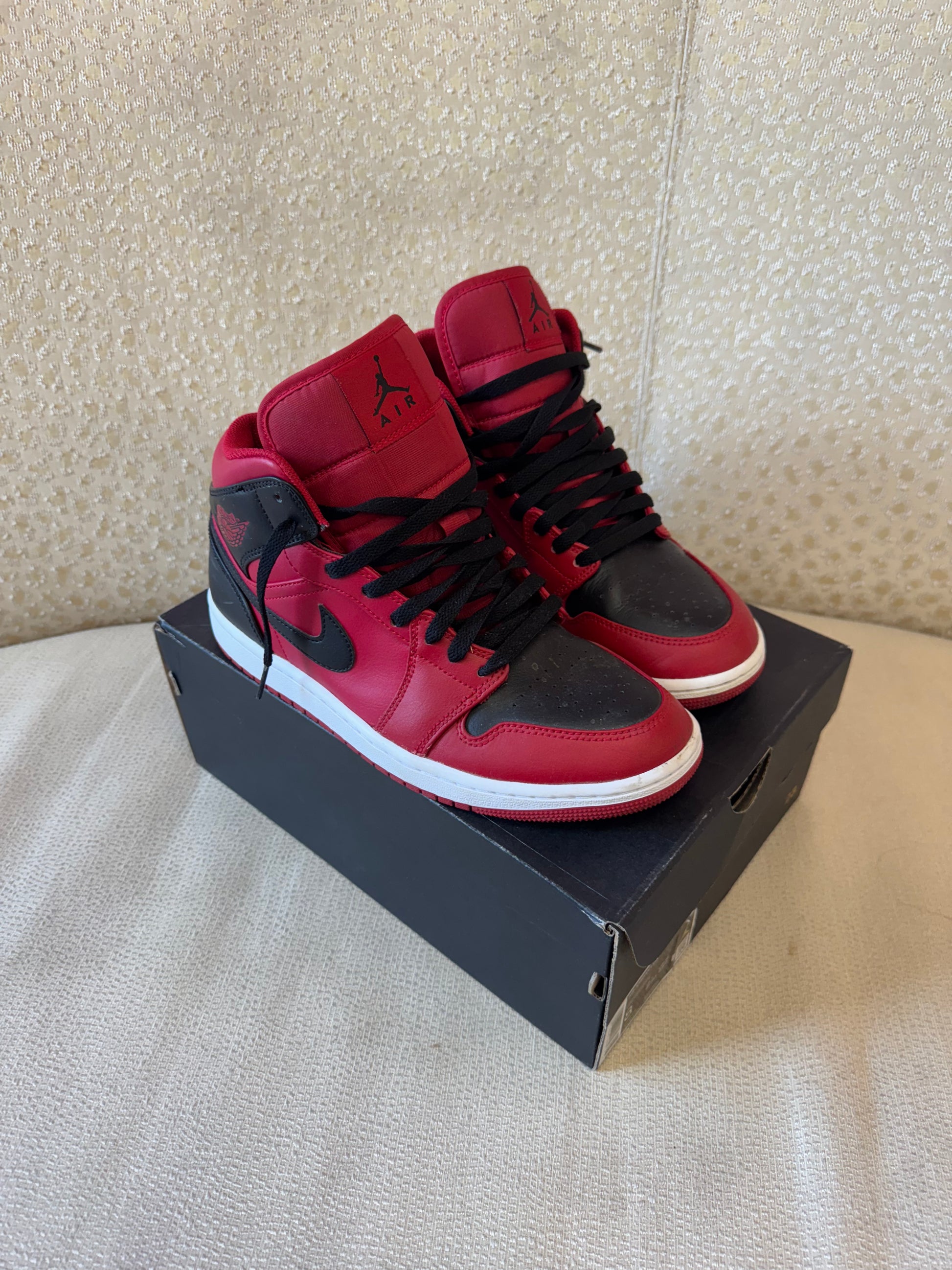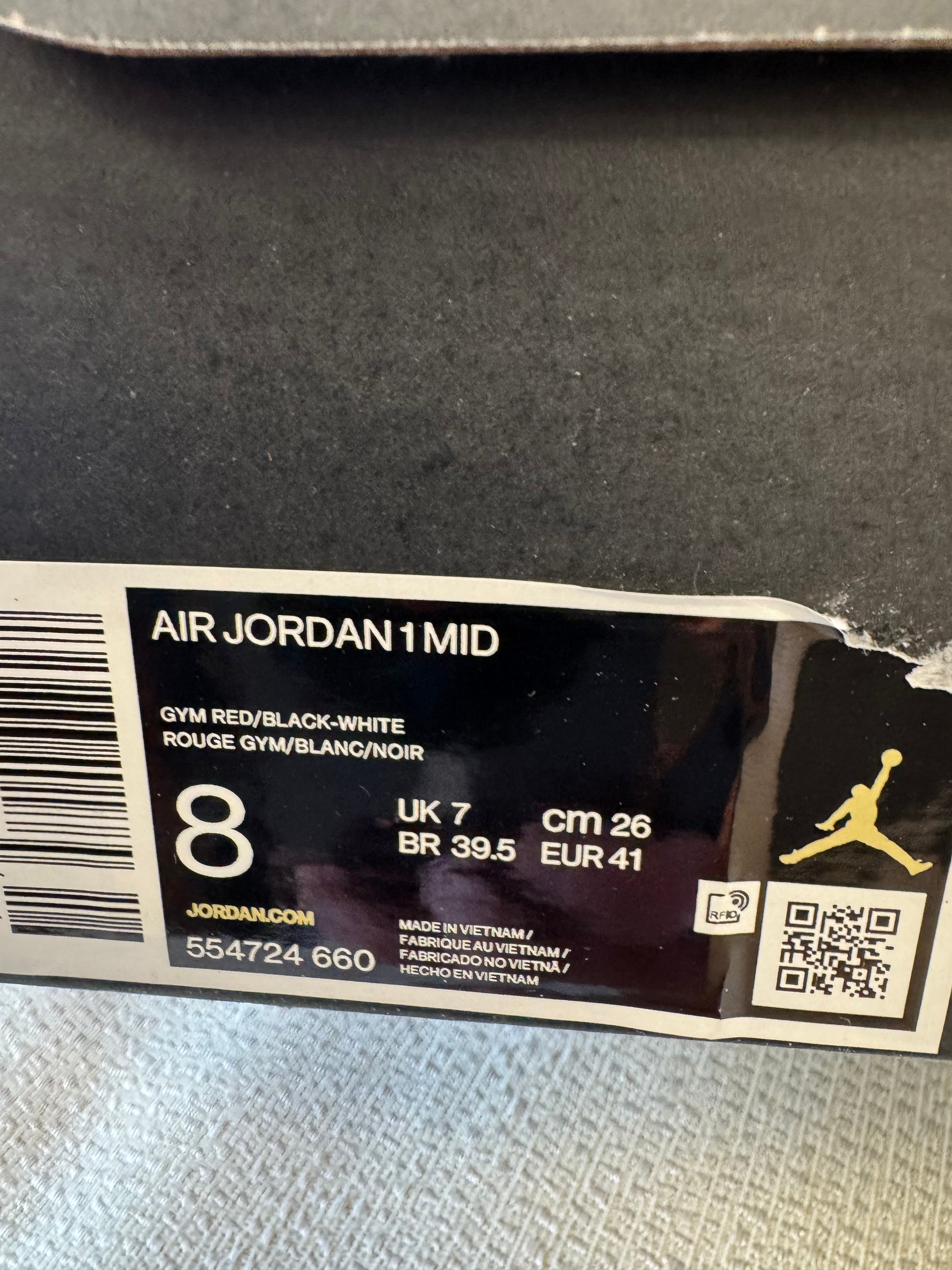 Very lightly worn. Gym red, black, and white Air Jordan 1 mid sneakers with box. Size: 8m/9.5 w