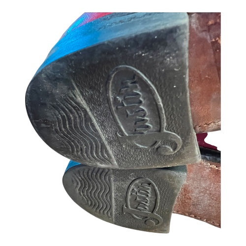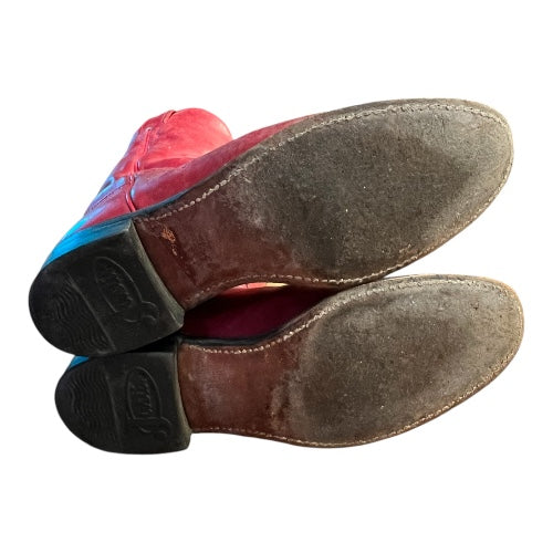 Justin brand “Roper” cowgirl boots in red. Round toe and low/no heel. Heel is just over one inch, and you honestly can’t get cowboy boots much lower than that. The soles are quite scuffed, but no holes and seem sturdy. Pull-on style. If you’re not into traditional super pointy western boots, or high heels, but still need something cute for the rodeo, this is the shoe for you. Regularly $199.99. Size 6B.