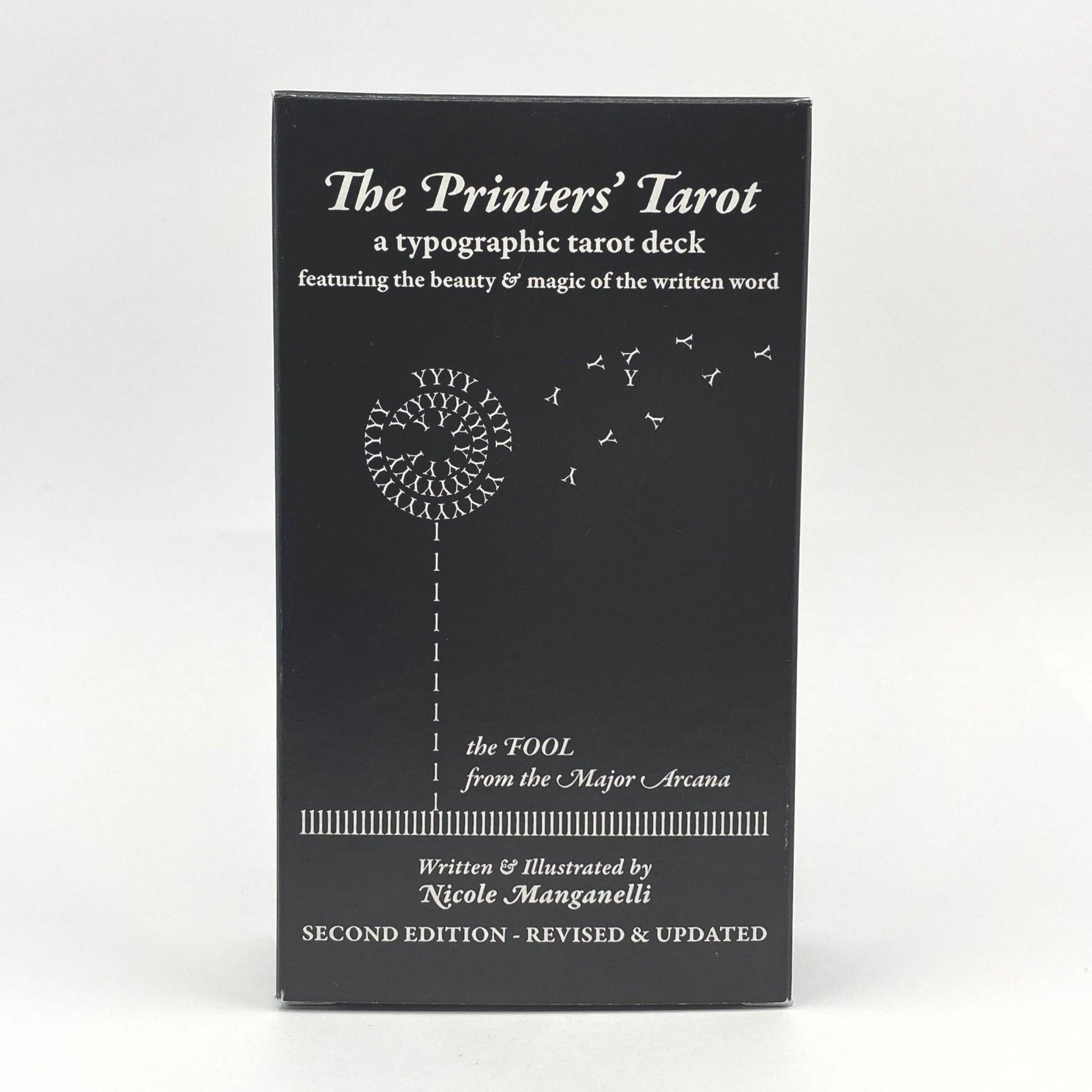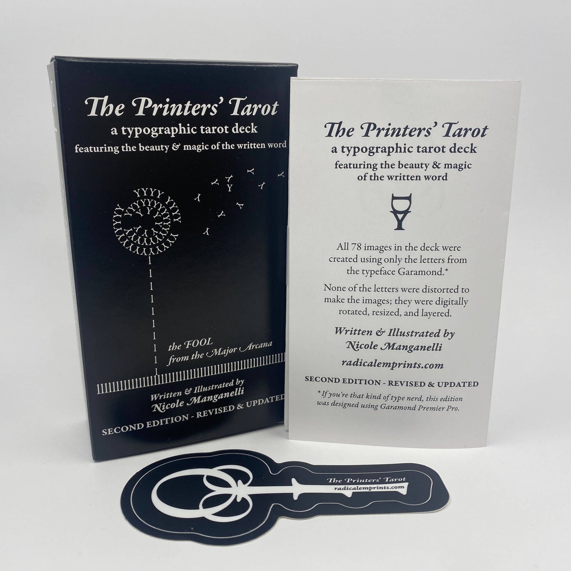 The Printers’ Tarot: Second Edition REVISED & UPDATED Contents: - The 78-card deck in its pretty new tuck box; - The companion guide, which includes interpretations for all the cards and a simple how-to guide for reading tarot; and - A die-cut sticker of the key from the KEYHOLDER card. About The Printers’ Tarot This 78-card black and white tarot deck is designed entirely using letterforms from the typeface Garamond* to create images. None of the letters were distorted to make the images; they were digitally rotated, resized, and layered.