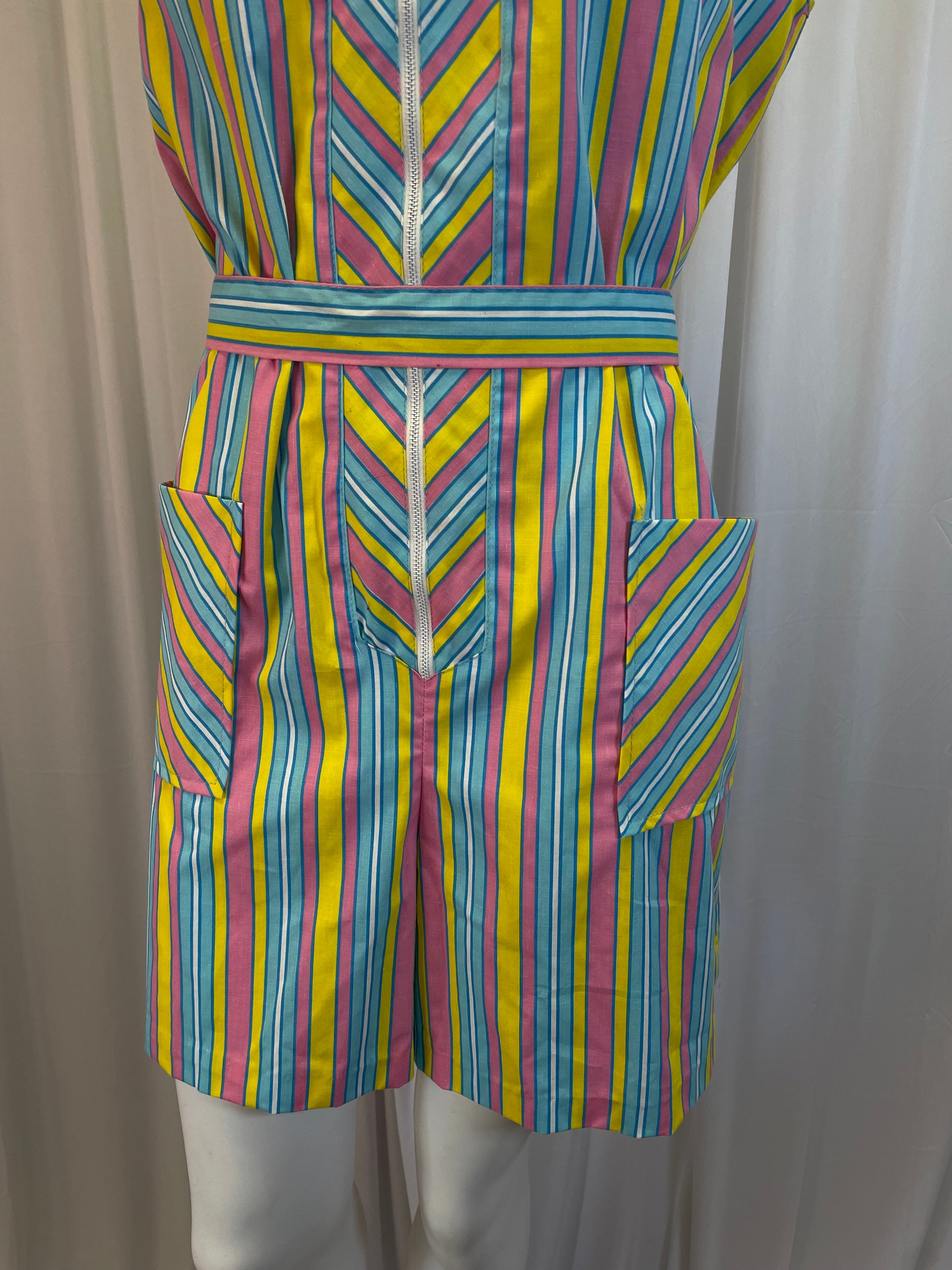Ridiculously cute vintage 70s zip-up striped romper + belt (shorts). Pink, blue, white, and yellow vertical stripes with diagonal stripes on the pockets. Great vintage condition! Fits a small to medium best.