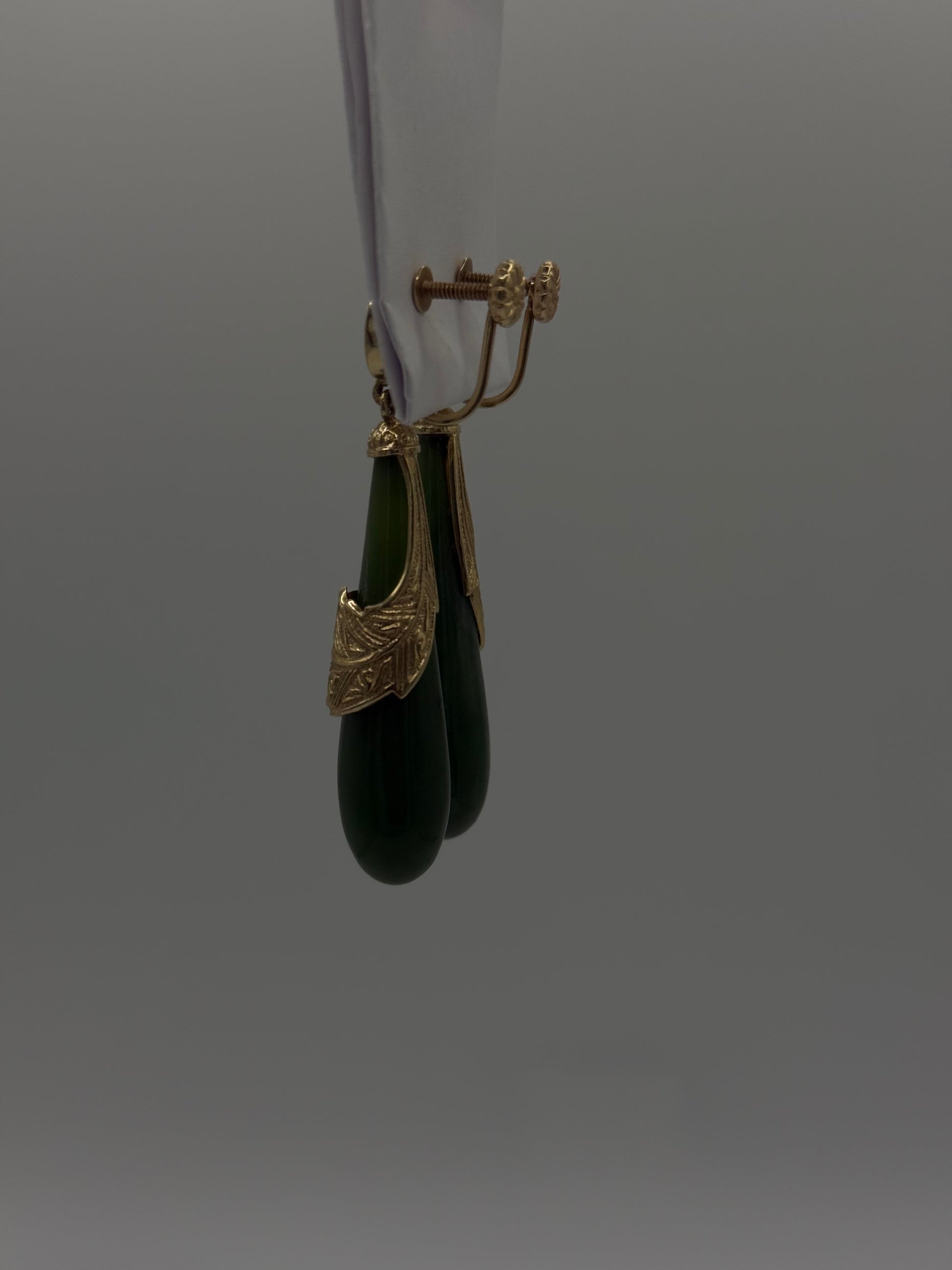 These are super cute jade-like teardrop shaped dangle earrings with really pretty gold accents. We can’t verify whether they are real jade or gold, but we believe it to be costume jewelry. In excellent condition, especially considering age.