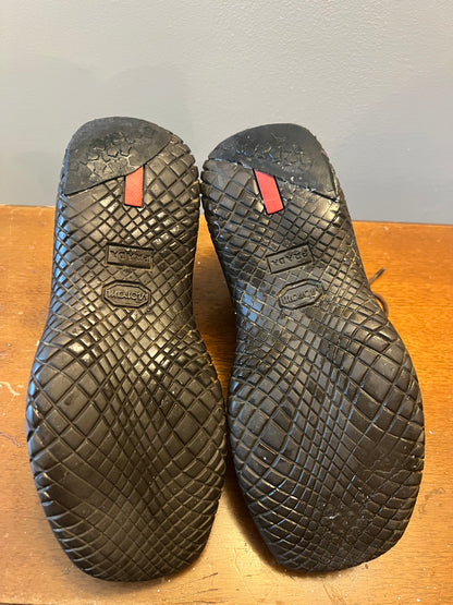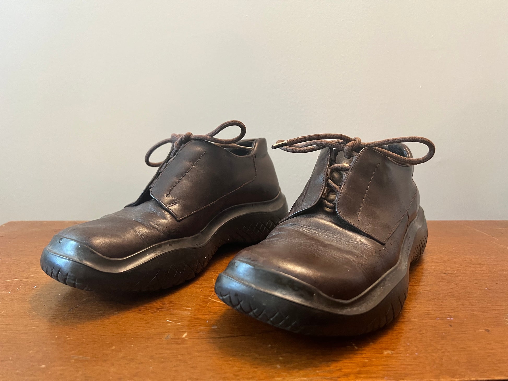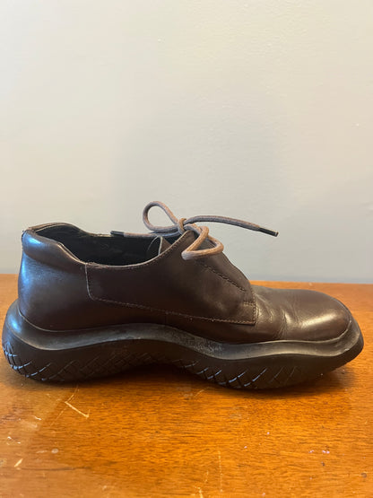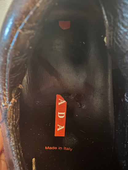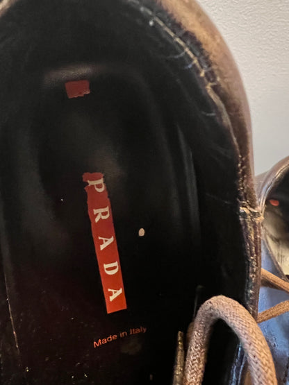 Worn, but still very sturdy and loads of life. Prada sneakers in dark chocolate brown. Vibram soles. Lace-up. Comfort meets couture. Slight separation on the back seam of one shoe (pictured). Could potentially be repaired by a cobbler, or worn as-is. Priced accordingly. Size 37.5.