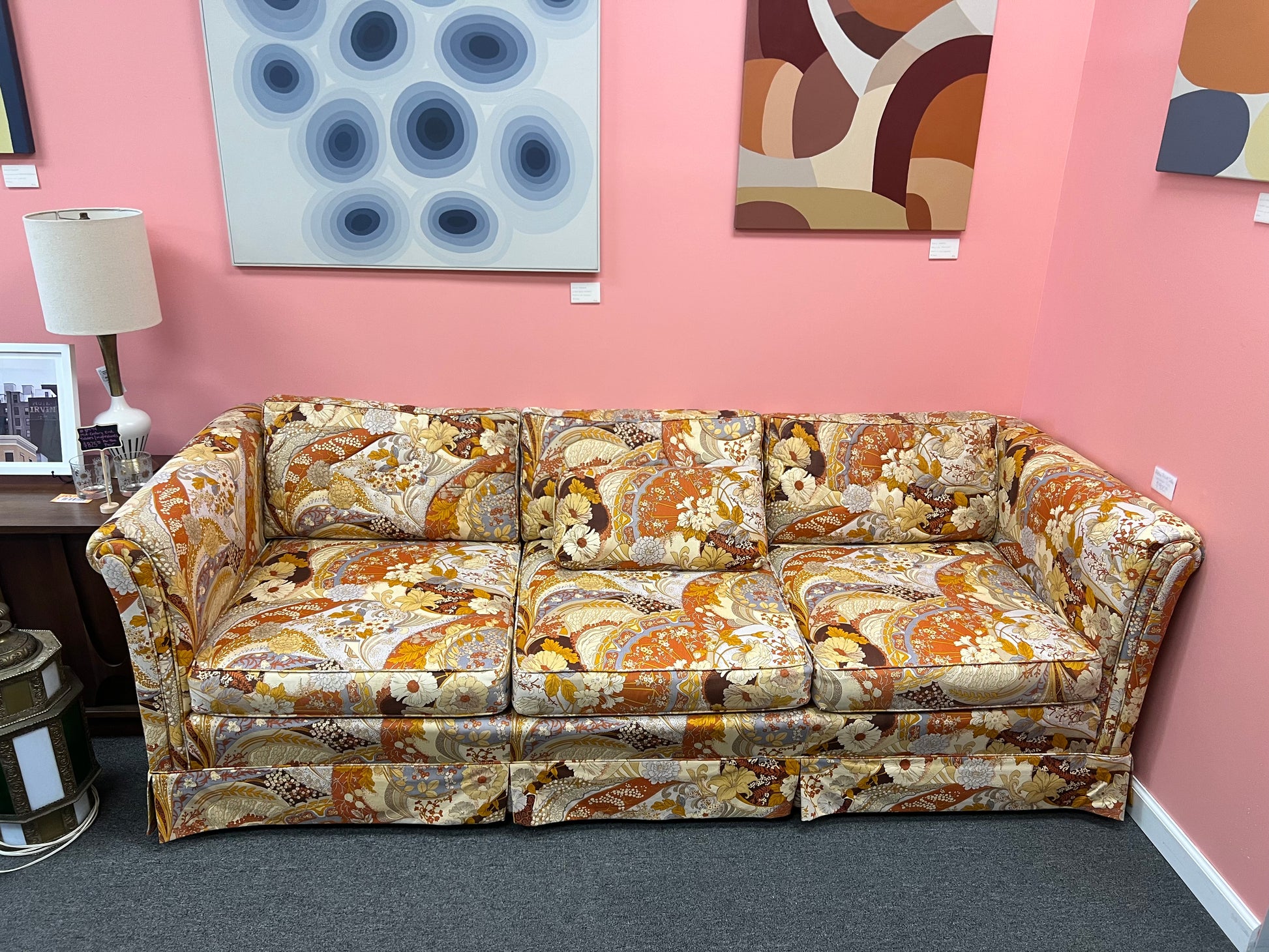 The fabric is in nearly perfect condition on this gorgeous time capsule piece. With shades of orange, lilac, and warm, neutral browns, this couch would look incredible in a modern, minimalist home. Alternately, you could go the opposite direction, because this sofa would also be a showstopper in a period-inspired aesthetic! Minimalist, maximalist…there’s so many ways you can take it. All we know is that everyone who sees it adores it.