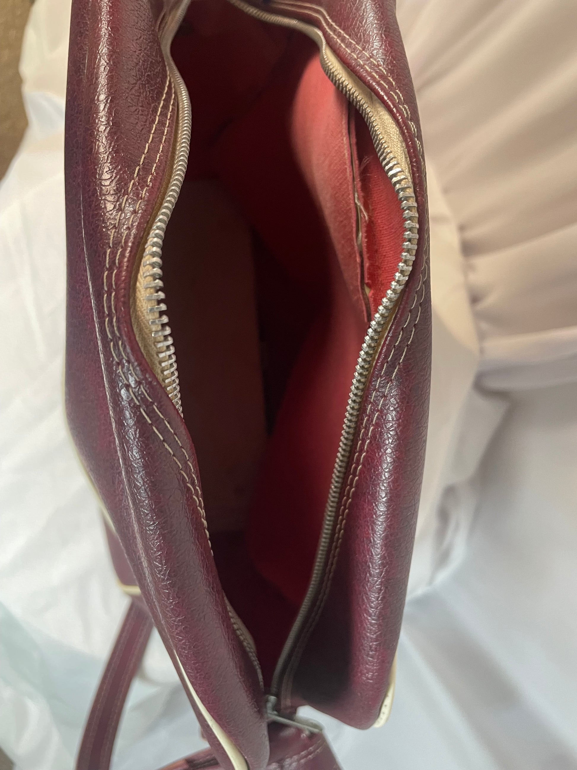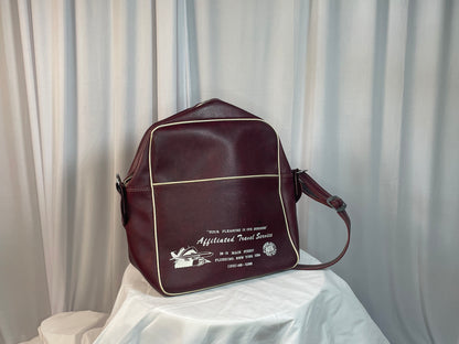 Burgundy faux-leather vintage travel bag from Affiliated Travel Services, Flushing, NY. It says “Your Pleasure is Our Business” with a cool, retro airport logo. Has a shoulder strap that can also be used cross-body if desired.