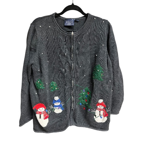 Crazy Horse by Liz Claiborne brand holiday cardigan sweater. Zips up the front, and has little pearl embellishments (snowflakes!). Three dimensional snowmen with scarves and Christmas lights on both front and back. No tags, but fits L/XL. So fun!