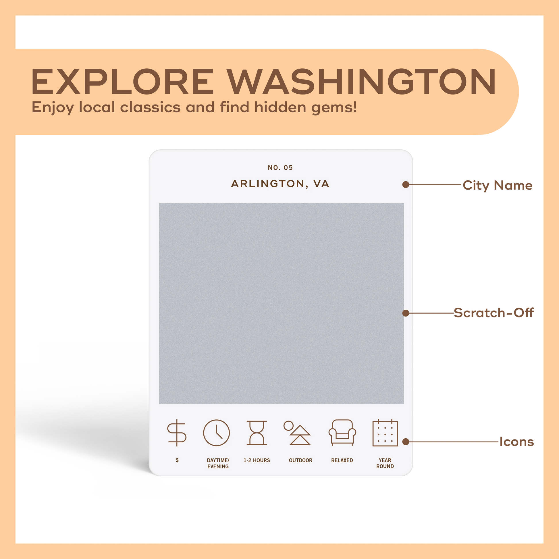 50 scratch-off bucket list adventures in & around Washington D.C. Pick an area that you want to explore, check out the icons at the bottom of the card to determine the season, cost, and time of day, and then scratch off the card to reveal your adventure!