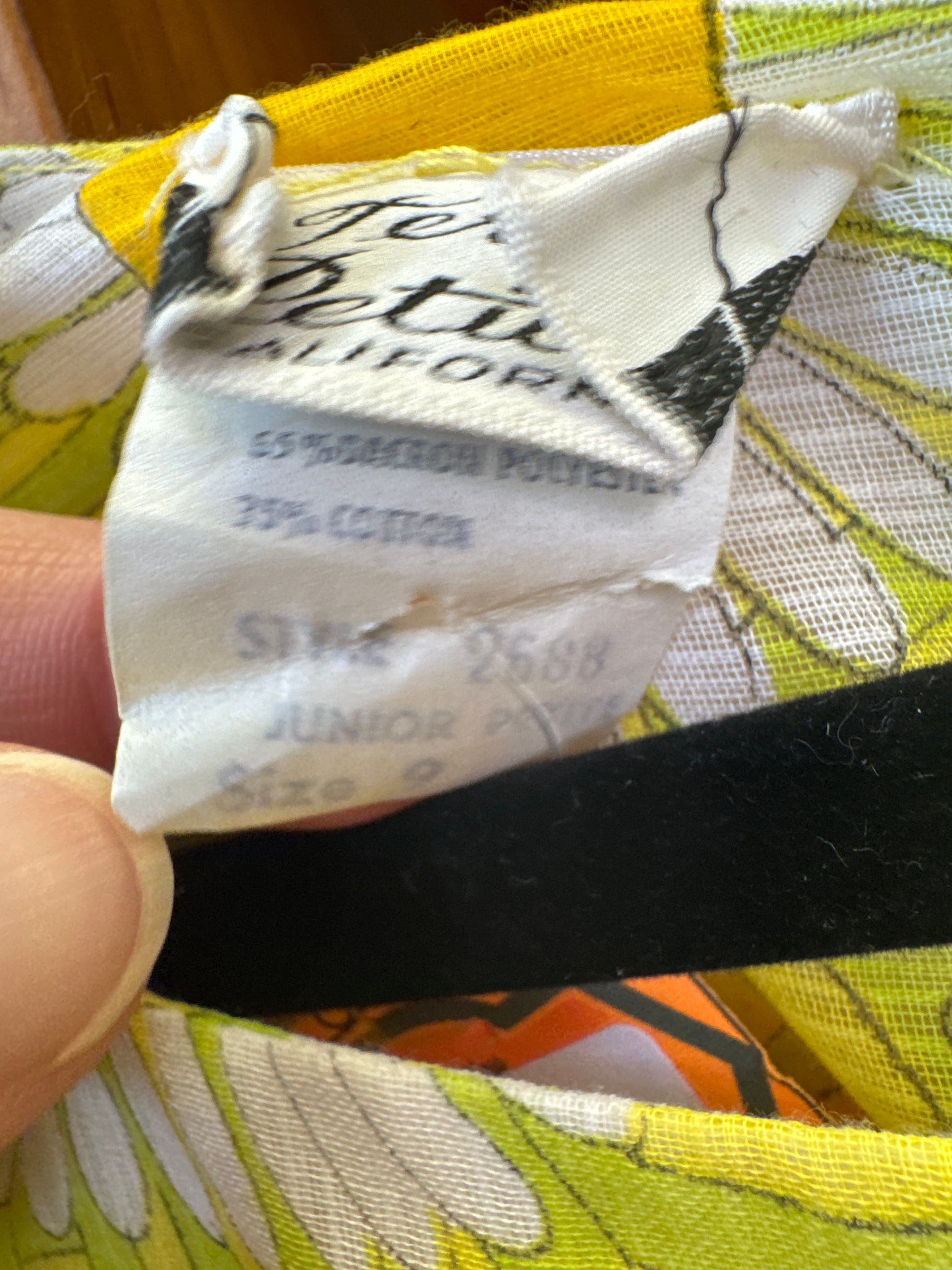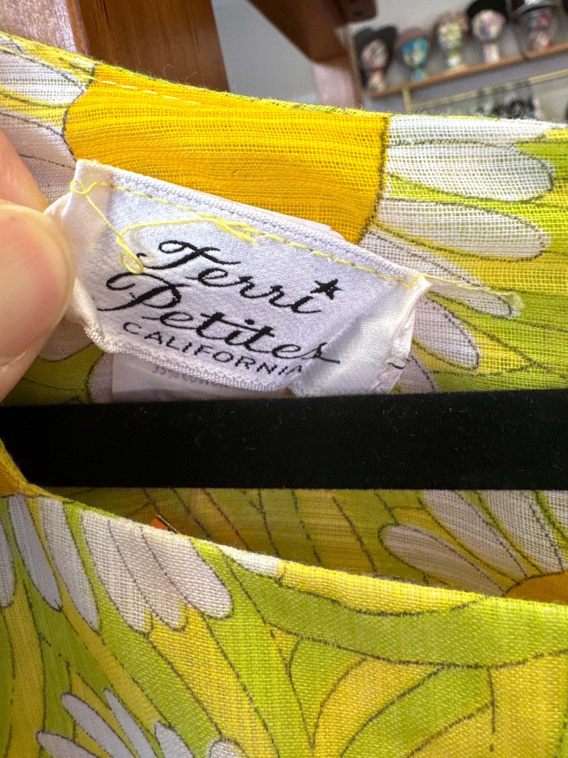 Yellow retro sunflower-patterned empire-waist 60s dress by Terri Petites California. The dress features a sheer outer layer, sheer sleeves, and matching fabric buttons on the cuffs. A vintage sunshine daydream.